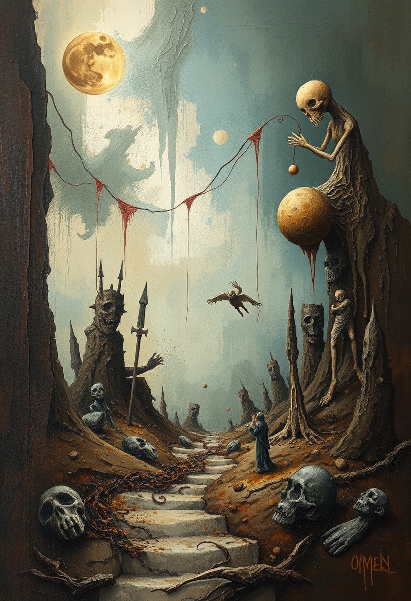 A dreamlike surreal image rendered in a strong moody style. The painting uses heavy impasto, abstract realism, bold brushstrokes, and raw textures. The color palette is earthy and muted, depicting fantastical elements and bizarre scenes with low contrast.