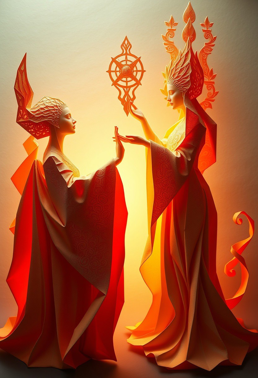 Warm intricate origami style, symbolist theme, ethereal figures with intricate details, luminous palette, allegorical subjects, spiritual symbolism, dreamlike composition, flowing drapery, celestial light, esoteric iconography, elongated forms, harmonious surreal aesthetic, folded paper look, geometric precision, reds oranges yellows.
