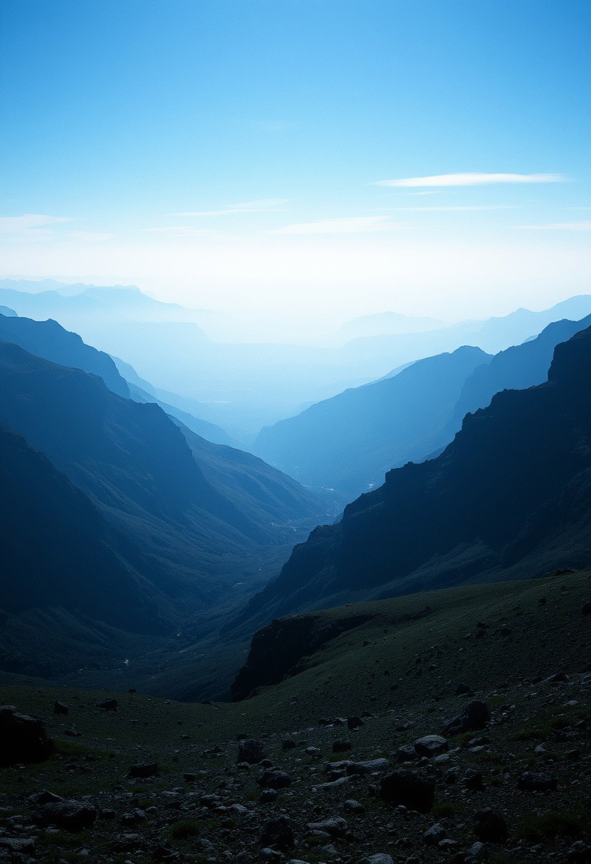 Immerse in a breathtakingly beautiful landscape: a vibrant blue-hued horizon stretches across the frame, fading into an atmospheric haze. Unusual dark colors, such as deep indigo and rich charcoal, punctuate the scene with dramatic flair. Cinematic lighting casts long shadows, emphasizing the fine details of the terrain. Film grain adds texture to the image, while superb composition guides the viewer's eye through the masterpiece. Maximum detail is achieved in every element, from the rugged terrain to the wispy clouds, creating an unparalleled level of visual mastery.