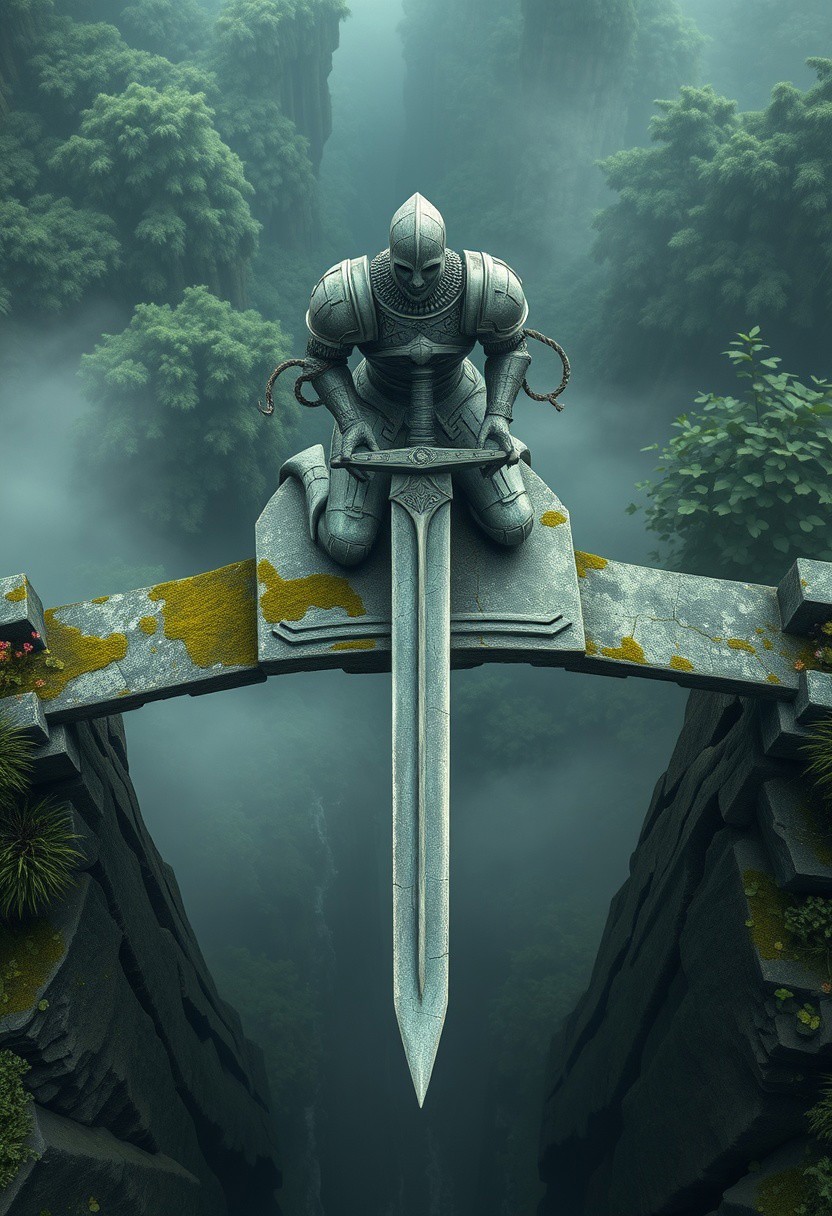 Here’s the revised prompt emphasizing the knight offering the sword like a tray, with hands beneath it: "A mesmerizing mystical landscape viewed from a bird’s-eye perspective, featuring a colossal stone knight as the central figure. The knight is in a kneeling position atop a moss-covered rocky pedestal, holding a massive sword horizontally in both hands as if offering it like a tray. His stone hands are positioned palms-up beneath the sword, supporting its weight. The sword, ancient and weathered, forms a bridge spanning a deep chasm, its surface cracked and adorned with creeping moss and vines. The knight’s figure, carved from weathered stone, is covered with intricate carvings and patterns, now faded by time, and further adorned with patches of moss and small plants growing from its crevices. Behind the bridge lies an enchanting, otherworldly forest, dense with towering trees and thick foliage. The forest is shrouded in a soft, glowing mist, with faint bioluminescent lights emanating from the vegetation, casting an ethereal glow. Rays of cinematic light break through the mist, illuminating the knight, the sword bridge, and the surrounding area with a surreal, golden-green hue. Every detail is rendered with maximum precision, from the textures of the knight’s cracked stone surface to the vibrant, mystical forest. The atmosphere is one of reverence, ancient mystery, and awe-inspiring beauty."