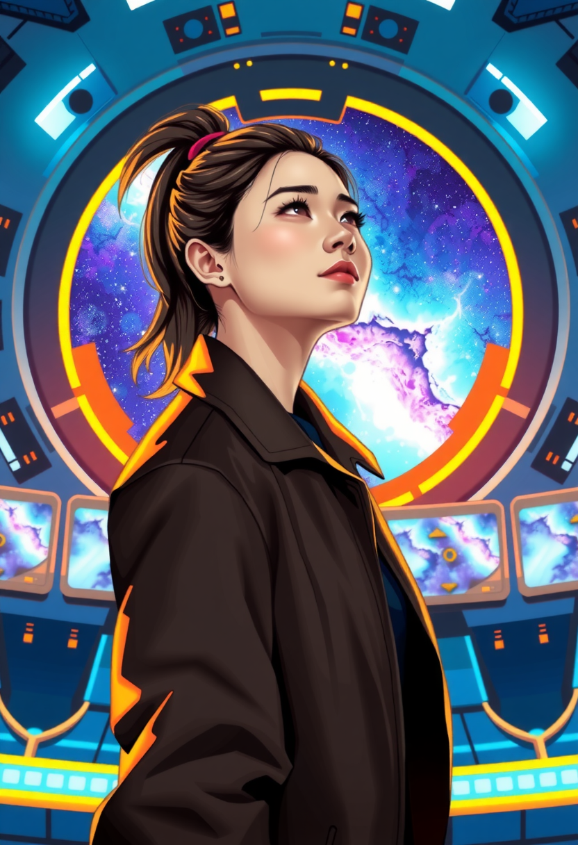 The image shows a young woman standing in a futuristic space station. She is wearing a brown jacket with a futuristic design on it and has her hair tied up in a high ponytail. The woman is looking up towards the sky with a thoughtful expression on her face. In the background, there is a large circular window with a blue and purple nebula-like pattern. The window is surrounded by orange and blue lights, and there are several screens on either side of the window. The overall mood of the image is calm and contemplative. In the style of kilian eng, vibrant colours, Hyper detailed, realisic digital painting, illustration, neo surrealism, chris saunders. neon outline, dmt trip. Detailed ink lines.