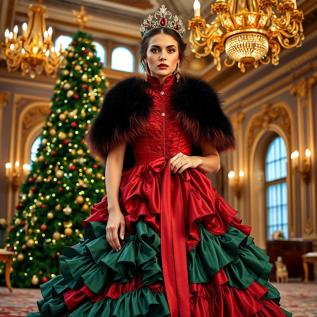 A luxurious Victorian-inspired Christmas gown with a high-collared neckline and opulent gold accents. The dress features layers of ruffled fabric in emerald green and crimson, with a sash tied at the waist. A fur-trimmed shawl drapes over the shoulders, and the model wears a glittering tiara adorned with holly berries. The background is a grand ballroom decorated with a towering Christmas tree and golden chandeliers. Keywords: Victorian, ruffled, high-collared, fur-trimmed, sash, tiara, holly, opulent