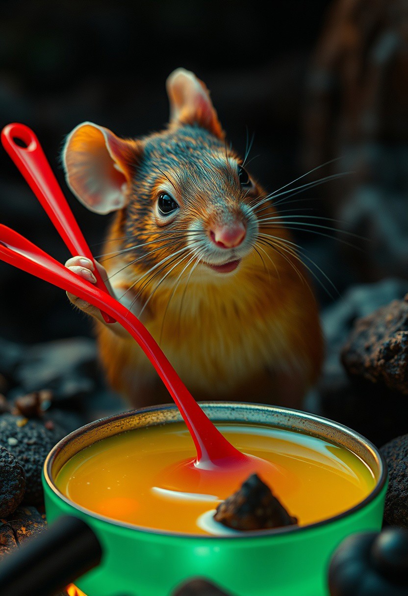 surreal VFX, nano-rat stirring broth on a campfire with a red spoon seen under an electron scanning microscope, with details, vivid colors