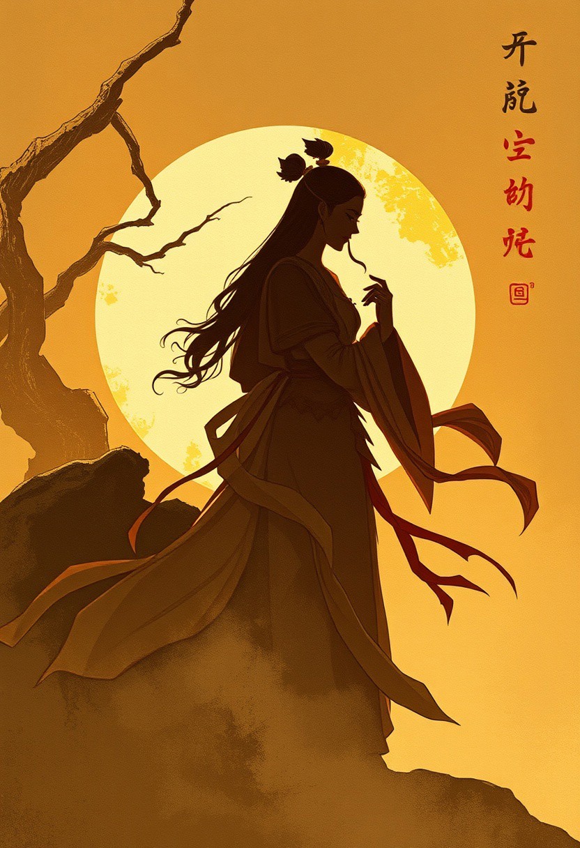 A dramatically lit, graceful and elegant silhouette of Niulang and Zhinv in a refined fantasy illustration. The Golden Age inspired artwork uses traditional media, warm earthy tones, and intricate textures to create a timeless charm.