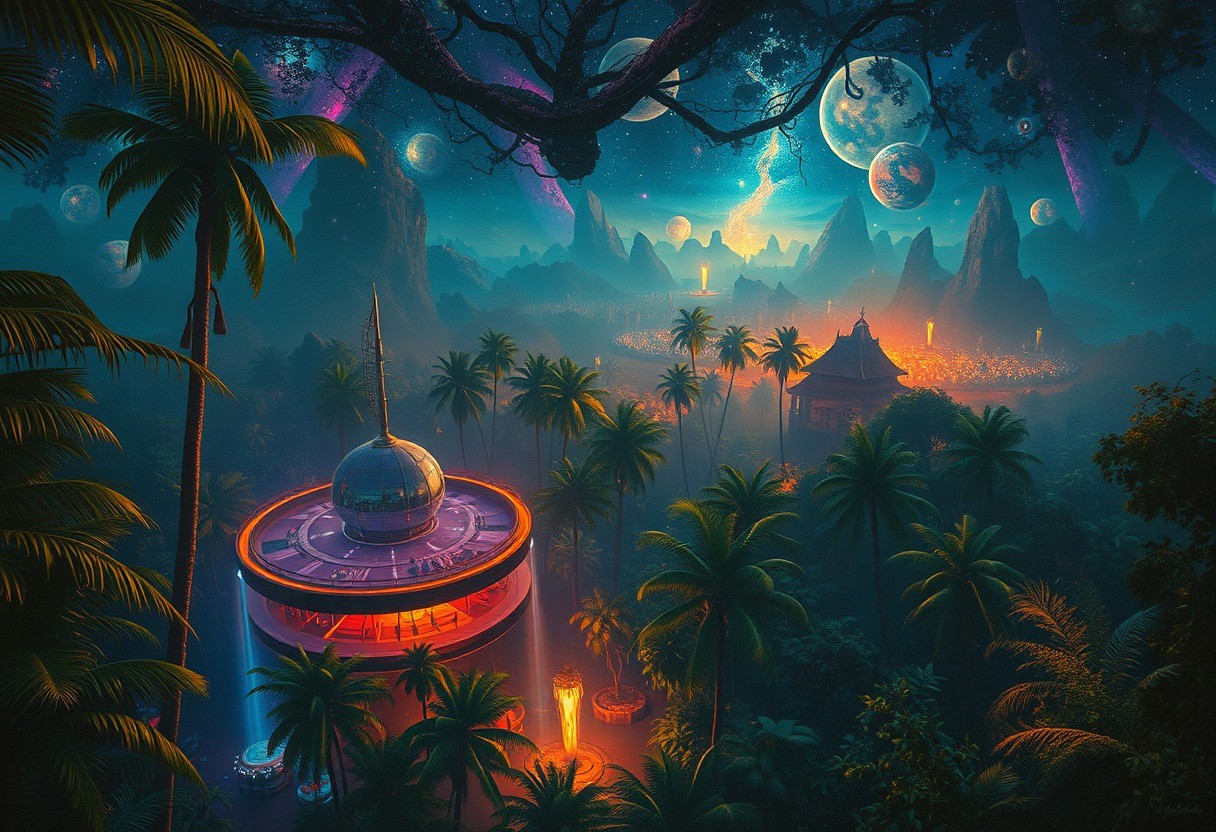 A nightclub in the middle of the jungle, view from above, in the style of an oil painting, scifi, cosmic, astral