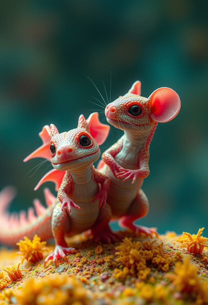 surreal VFX, nano-dragon and nano-rat best friends for life seen under an electron scanning microscope, with details, vivid colors