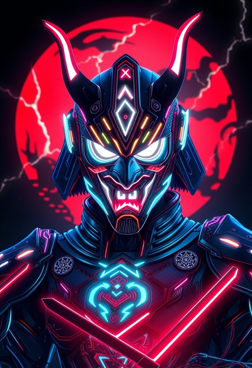 masterpiece, best quality, volumetric lighting, neon colors, dark background, 1man, male, closeup, Raijin with an oni mask, god of thunder, god of lighting, god of lightning, thunder, and storms, cyber tron neon Raijin armor, full armor, Covered face, covered eyes, standing in front of a tomoe, tomoe background, cyber horns, ninja pose, kunai, blades, flying raijin, so fast leaving mirages, katana