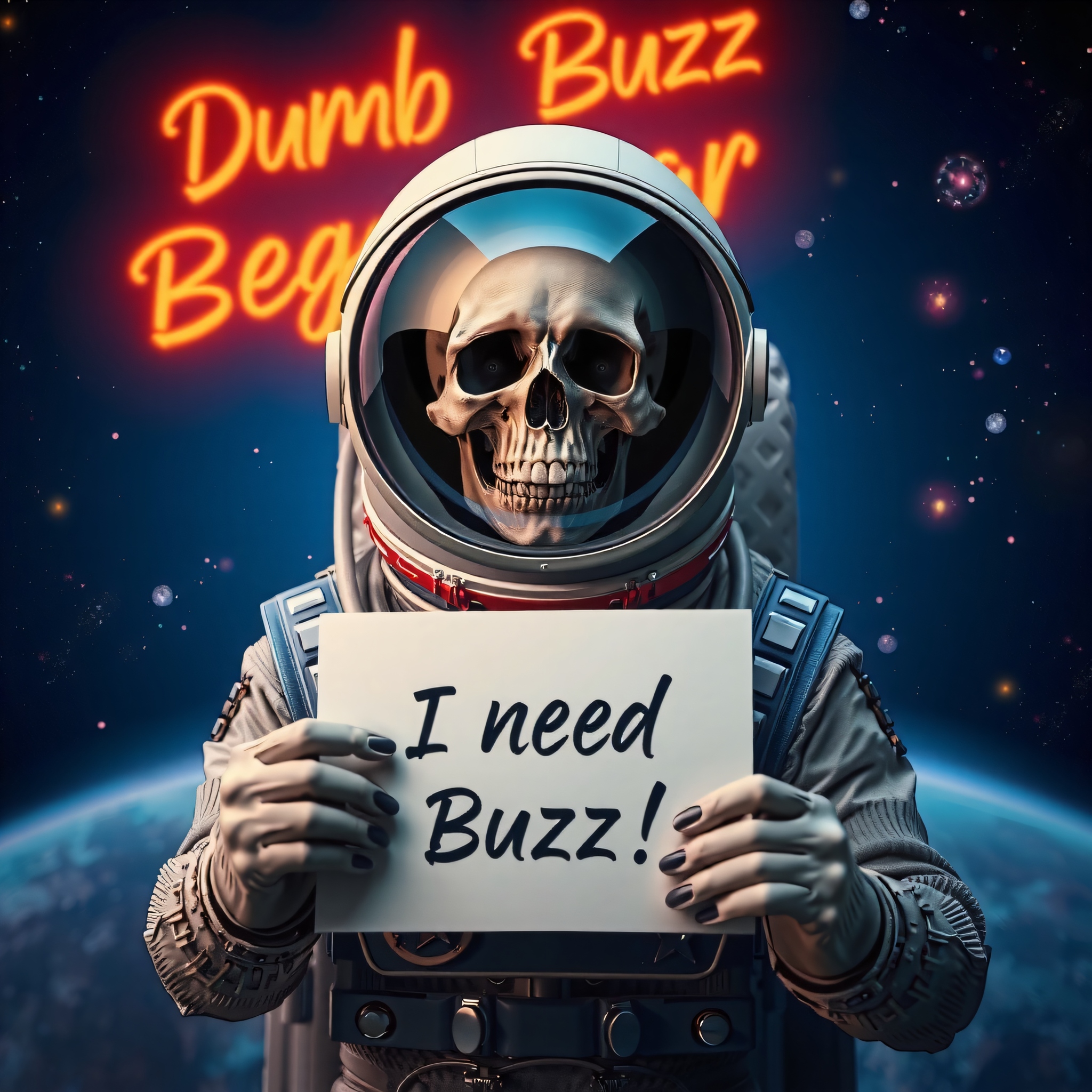 masterpiece, intricate photo, realistic outer space skull astronaut in astronaut suite with helmet and transparent visor holding a small white sign on which is written "I need Buzz!", background outer space, stars, galaxies, nebulae, in the background is written in the sky in neon letters "Dumb Buzz Beggar", hyper realistic, highly detailed, sharp focus, dawn of technology, dark art, gothic art, cyberpunk style, best quality, high resolution, colorful, vibrant colors, studio lighting, high quality image, no wrong proportions, 8K