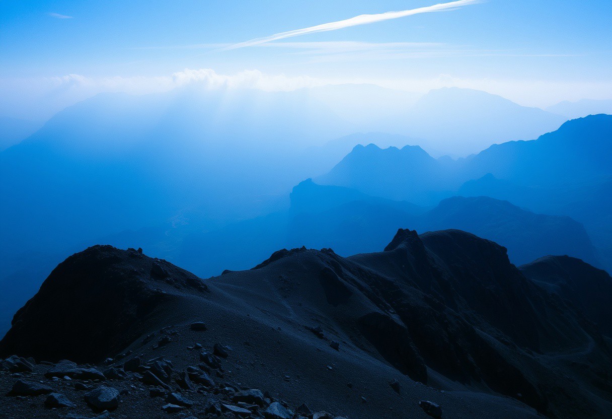 Immerse in a breathtakingly beautiful landscape: a vibrant blue-hued horizon stretches across the frame, fading into an atmospheric haze. Unusual dark colors, such as deep indigo and rich charcoal, punctuate the scene with dramatic flair. Cinematic lighting casts long shadows, emphasizing the fine details of the terrain. Film grain adds texture to the image, while superb composition guides the viewer's eye through the masterpiece. Maximum detail is achieved in every element, from the rugged terrain to the wispy clouds, creating an unparalleled level of visual mastery.