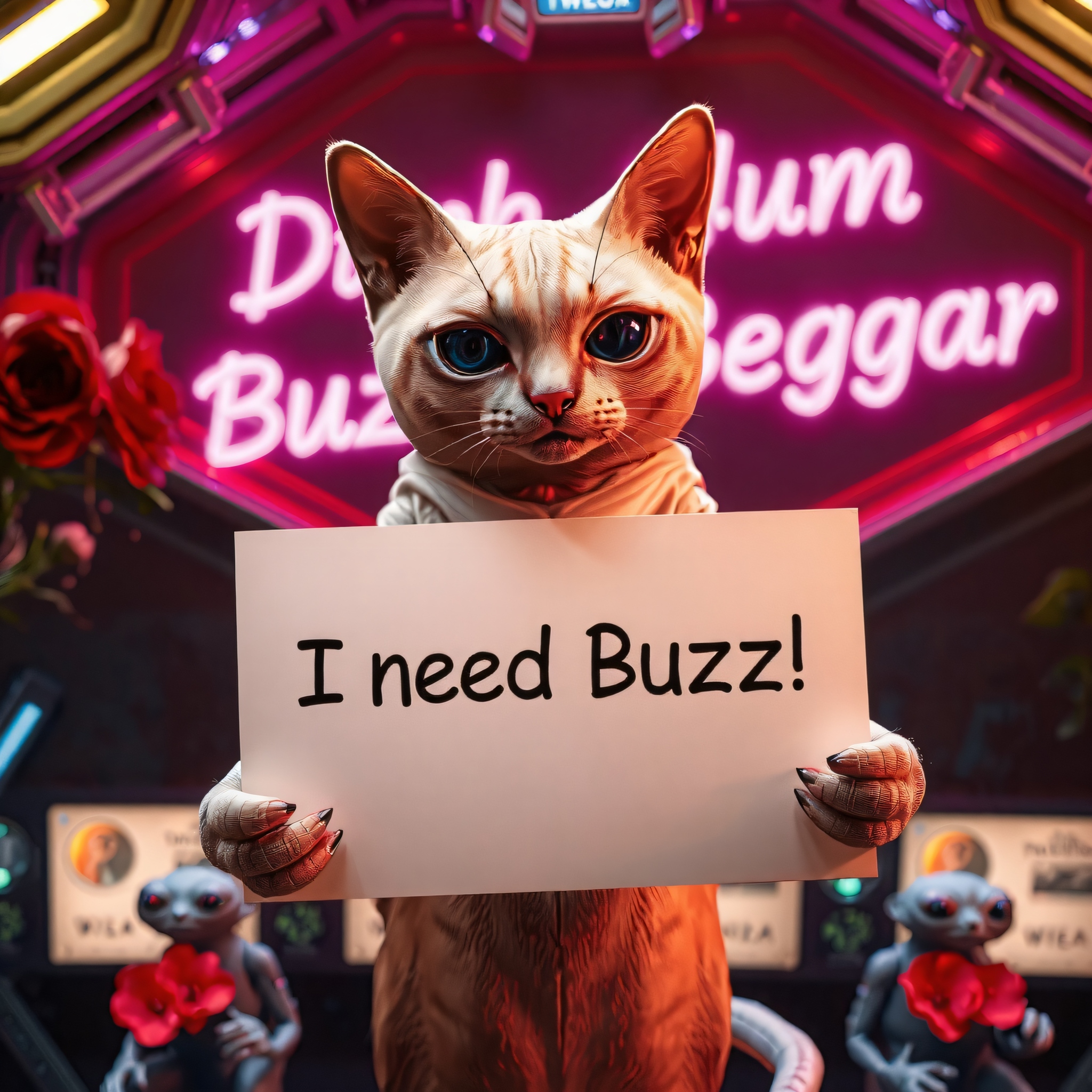 masterpiece, intricate photo, realistic outer space humanoid alien cat holding a white sign on which is written "I need Buzz!", background interior of a spcecraft, giant alien flowers at the walls, in the background is written in neon letters "Dumb Buzz Beggar", hyper realistic, highly detailed, sharp focus, crepuscular lights in the background, dawn of technology, dark art, gothic art, cyberpunk style, best quality, high resolution, colorful, vibrant colors, cozy indoor lighting, 8K, easypositive