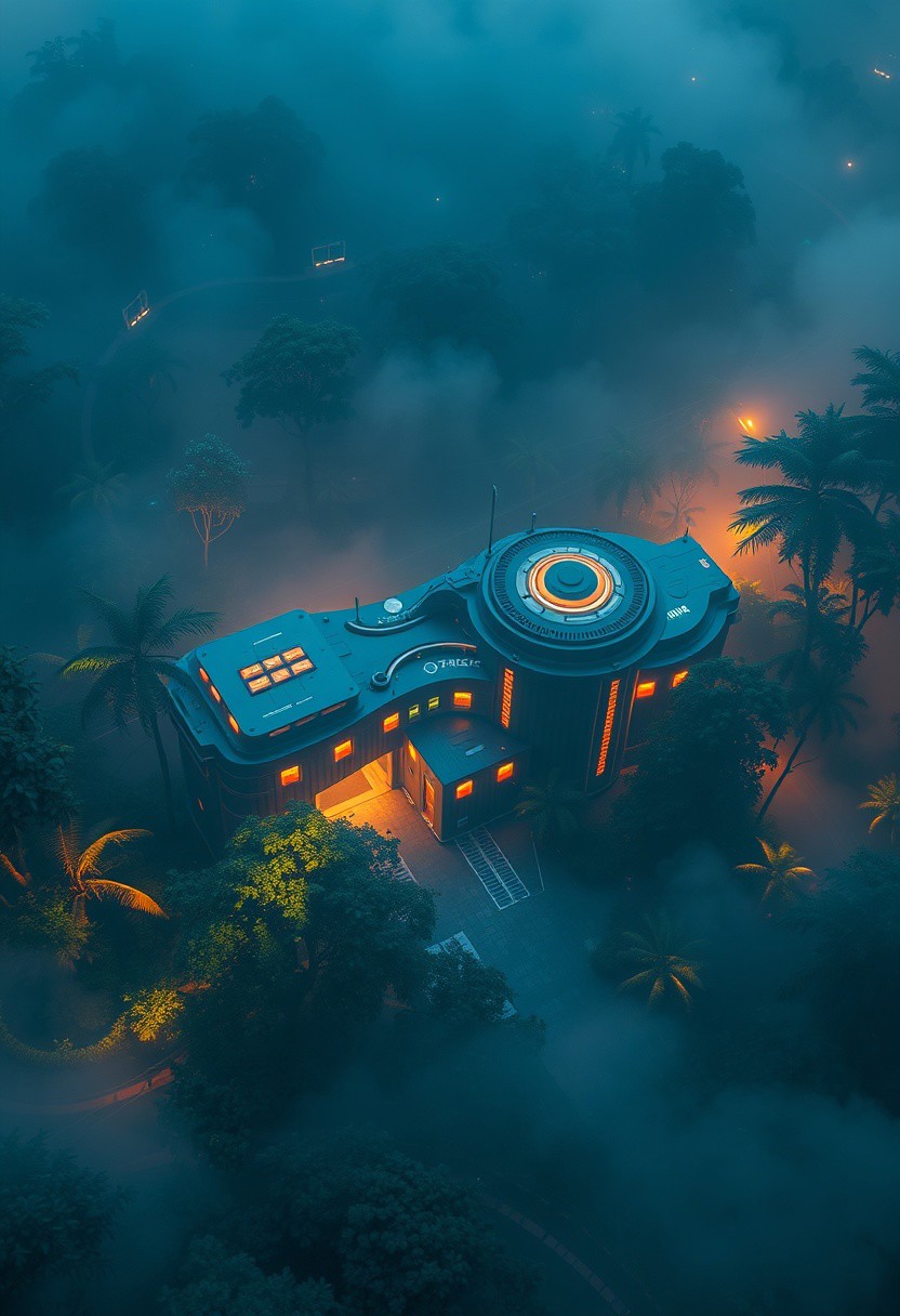 aerial view, a futuristic research complex in a bright foggy jungle, hard lighting