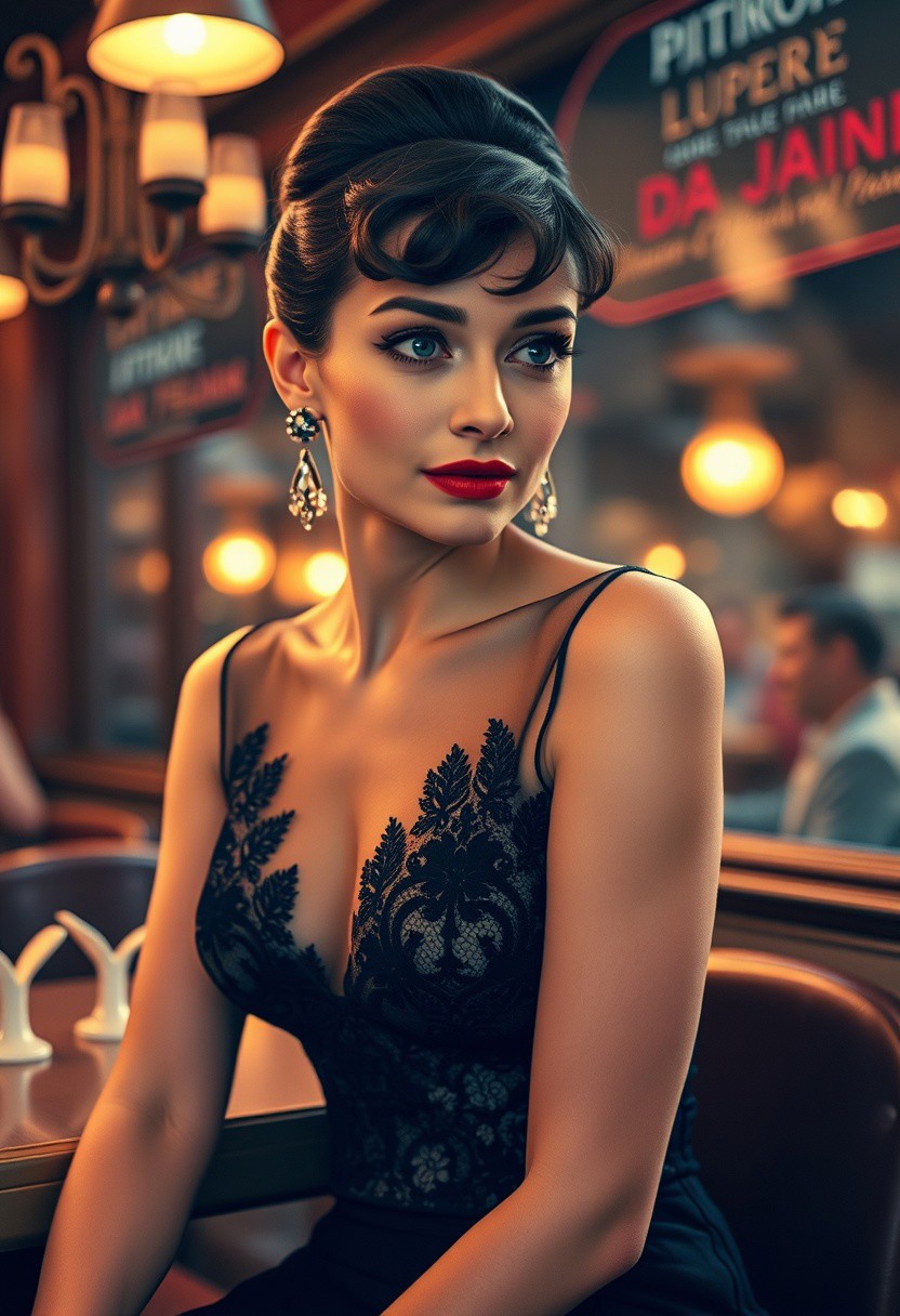 Audrey Hepburn, 1953, whimsical elegance, wearing a sluty transparent lace black dress, soft lighting, vibrant colors, set in a retro Parisian cafe, inspired by vintage fashion photography, playful expression, cinematic glow, 4K detail, iconic beauty