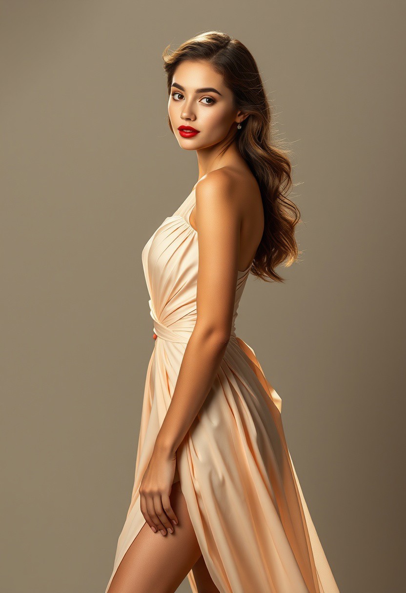 Beautiful female in a stunning light dress, full body shot, elegant, Red lipstick, very realistic, high detailed, 8k