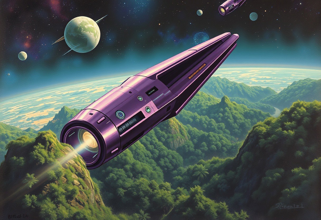 A phallic purple metallic spacecraft orbiting over a jungle planet, close up on the spaceship, in the style of an oil painting, scifi, cosmic, astral