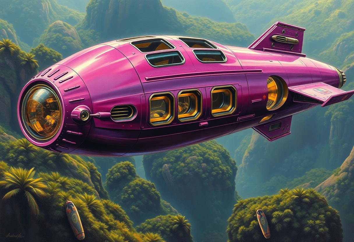 A phallic purple metallic spacecraft with lots of windows orbiting over a jungle planet, close up on the spaceship, in the style of an oil painting, scifi, cosmic, astral