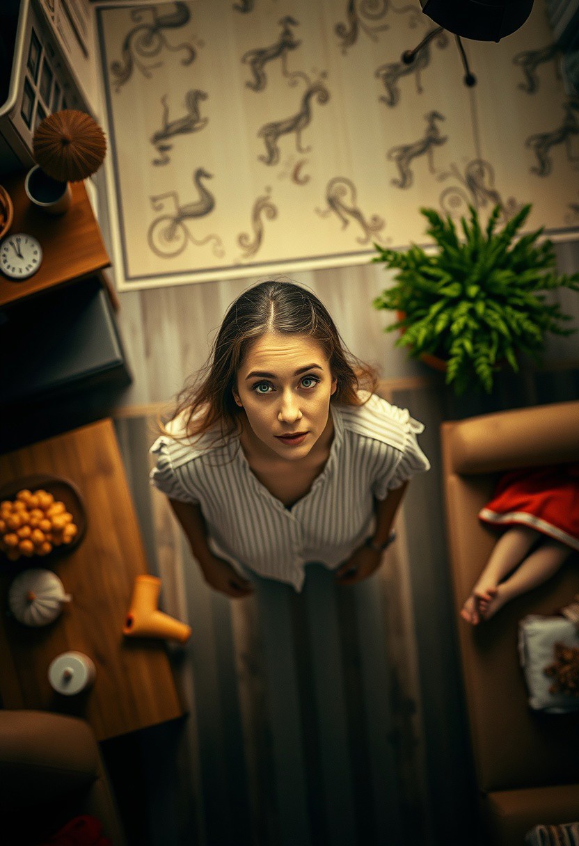 An overhead bird's-eye view documentary photograph of a woman in a suburban setting. Intense dramatic lighting and high contrast create tension, highlighting a meticulously composed scene in warm nostalgic tones, offering a top-down perspective on family and domestic life.