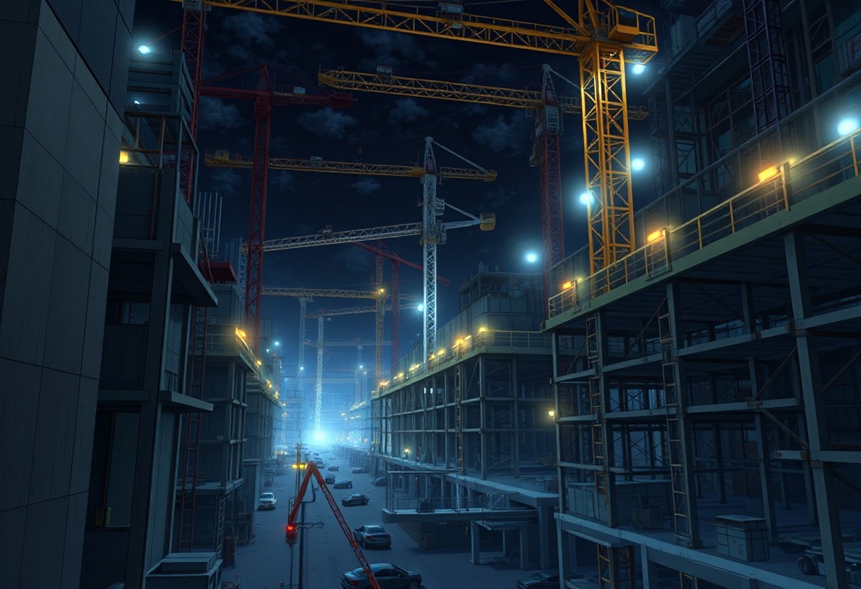 A screenshot of an anime, a construction site at night, with complex and intricate movements. Walking alone there is quite terrifying.