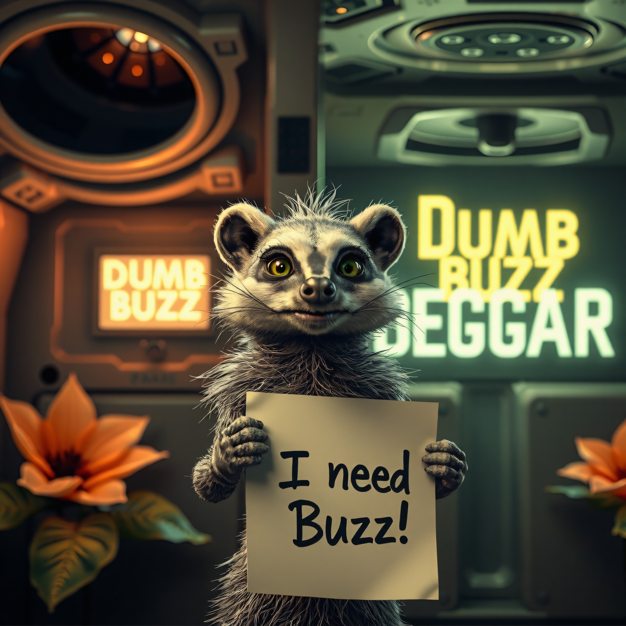 masterpiece, intricate photo, realistic outer space alien animal grinch badger holding a white sign on which is written "I need Buzz!", background interior of a spcecraft, giant alien flowers at the walls, in the background is written in neon letters "Dumb Buzz Beggar", hyper realistic, highly detailed, sharp focus, crepuscular lights in the background, dawn of technology, dark art, gothic art, cyberpunk style, best quality, high resolution, colorful, vibrant colors, cozy indoor lighting, 8K, easypositive, highy quality image, no wrong proportions