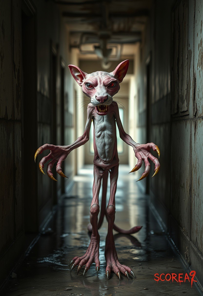 score_9, score_8_up, score_7_up, score_6_up, depth of field, highly detailed, BREAK Pink Panther, malnourished, skinny, bony, sunken eyes, dirty matted fur, mange, patches of fur missing, scabs, claw marks, anaemia, bones visible under flesh, glowing red eyes, long mangled claws, long mangles finger nails, hyper realistic hands and feet, long gnarled teeth, long arms, long fingers, malformed, extremely narrow waist, hipbone visible, ghoulish,no human, BREAK in a long hallway stands the Pink Panther, this Pink Panther is a twisted creature unlike his well known counterpart, Pink Panther is standing in a doorway, menacingly, with his hands by his sides, his hands reach and are dragging on the floor, Pink Panther is walking towards the viewer at the other end of the hallway, the building is dilapidated with water damage, water is dripping from the ceiling and running down the walls, it is dark, low lighting, mold is growing on the walls, this building has been abandoned and condemned, night, doorway,,low key,dramatic lighting, film grain,