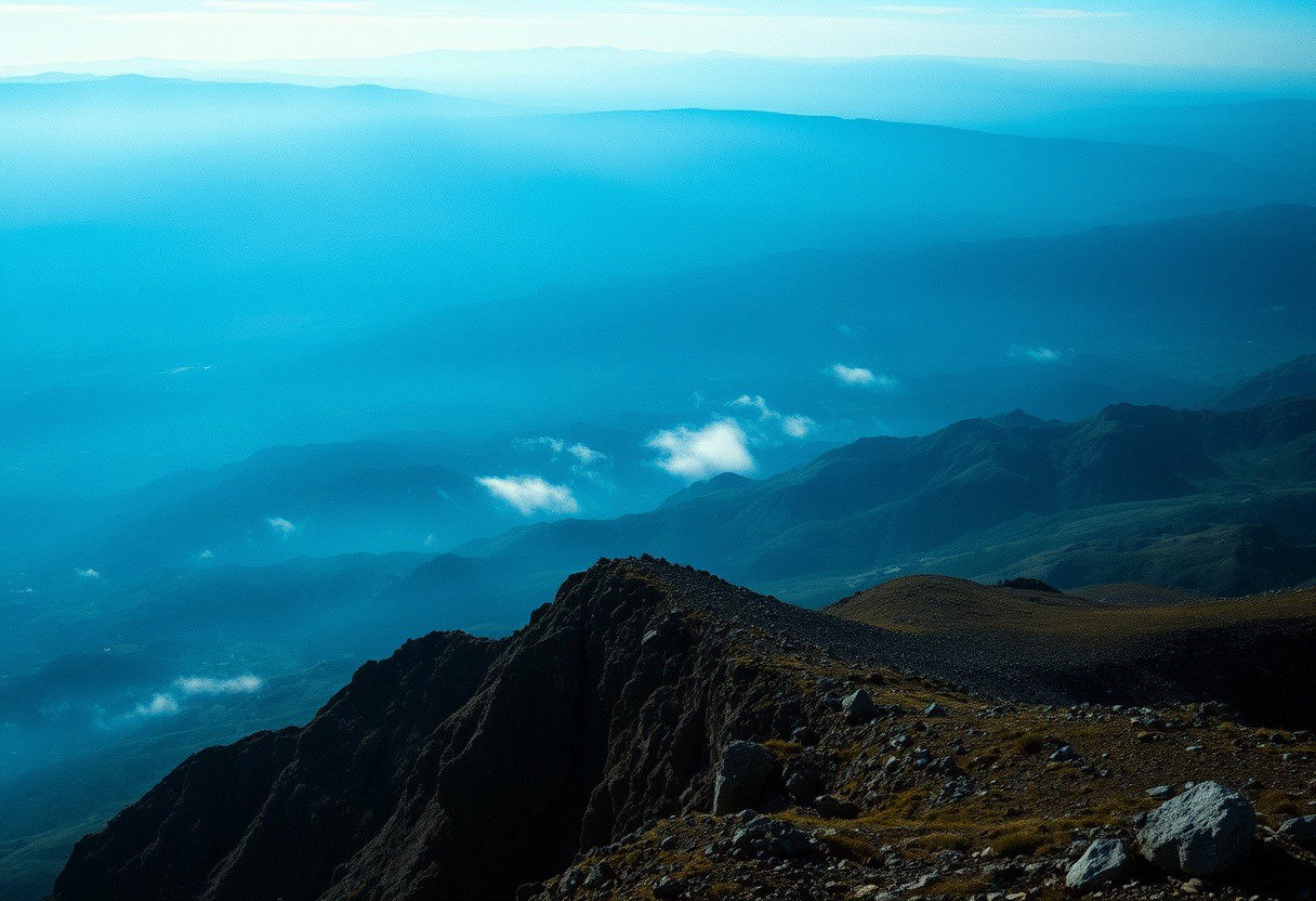 Immerse in a breathtakingly beautiful landscape: a vibrant blue-hued horizon stretches across the frame, fading into an atmospheric haze. Unusual dark colors, such as deep indigo and rich charcoal, punctuate the scene with dramatic flair. Cinematic lighting casts long shadows, emphasizing the fine details of the terrain. Film grain adds texture to the image, while superb composition guides the viewer's eye through the masterpiece. Maximum detail is achieved in every element, from the rugged terrain to the wispy clouds, creating an unparalleled level of visual mastery.