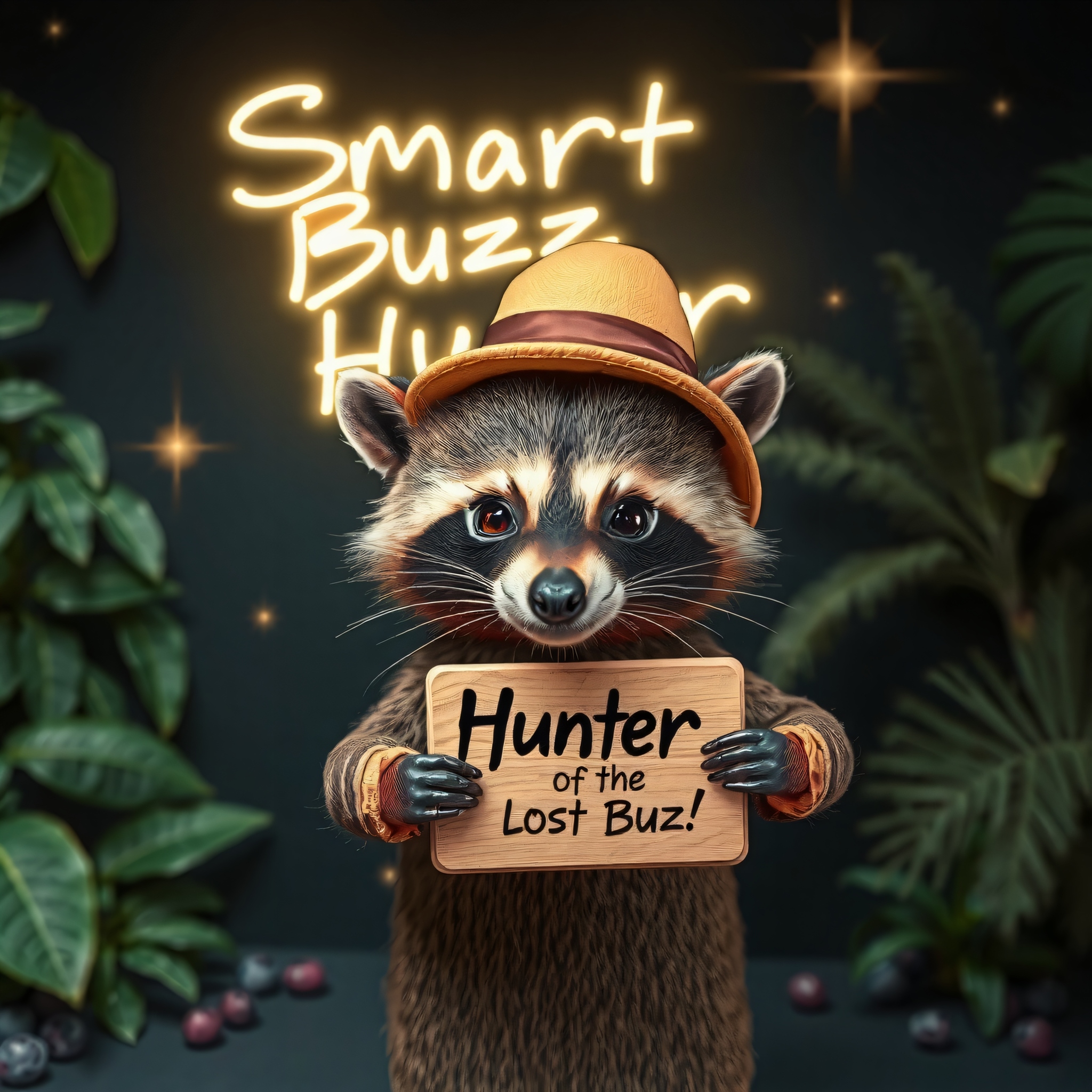 masterpiece, intricate photo realistic photo, cute racoon wearing hat holding a small beige wooden plate on which is written "Hunter of the lost Buzz!", background jungle, stars, galaxies, nebulae, in the sky is written in neon letters "Smart Buzz Hunter", as realistic as possible, hyper realistic, highly detailed, sharp focus,dark art, gothic art, cyberpunk style, best quality, high resolution, colorful, vibrant colors, studio lighting, 8K