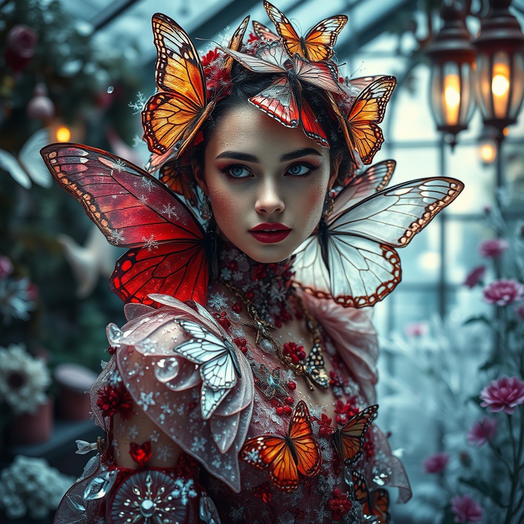 High fashion portrait of a living Christmas butterfly collection, dress made of thousands of crystalline butterfly wings that slowly move and change color from deep velvet red to frost white, face partially covered with delicate wing-shaped snowflakes, hair woven with living winter butterflies made of ice and gold, background of vintage botanical illustrations coming to life, gothic greenhouse setting with frozen flowers, soft ethereal lighting with rainbow prism effects, photorealistic details