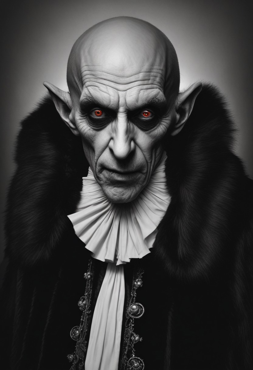symmetrical Medium shot of Nosferatu, the vampire, pale skin, a lot of fangs in his mouth, black blood in his mouth, opened mouth, traditional long folk romanian moustache, dark bown long fur collar, black ancient romanian coat with silver round buttons, black background, dynamic shadows dramatic lights, desaturated colors