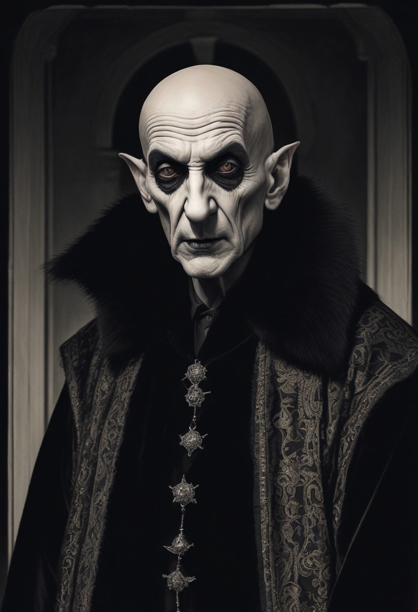 symmetrical Medium shot of Nosferatu, the vampire, pale skin, a lot of fangs in his mouth, black blood in his mouth, opened mouth, traditional long folk romanian moustache, dark bown long fur collar, black ancient romanian coat with silver round buttons, black background, dynamic shadows dramatic lights, desaturated colors