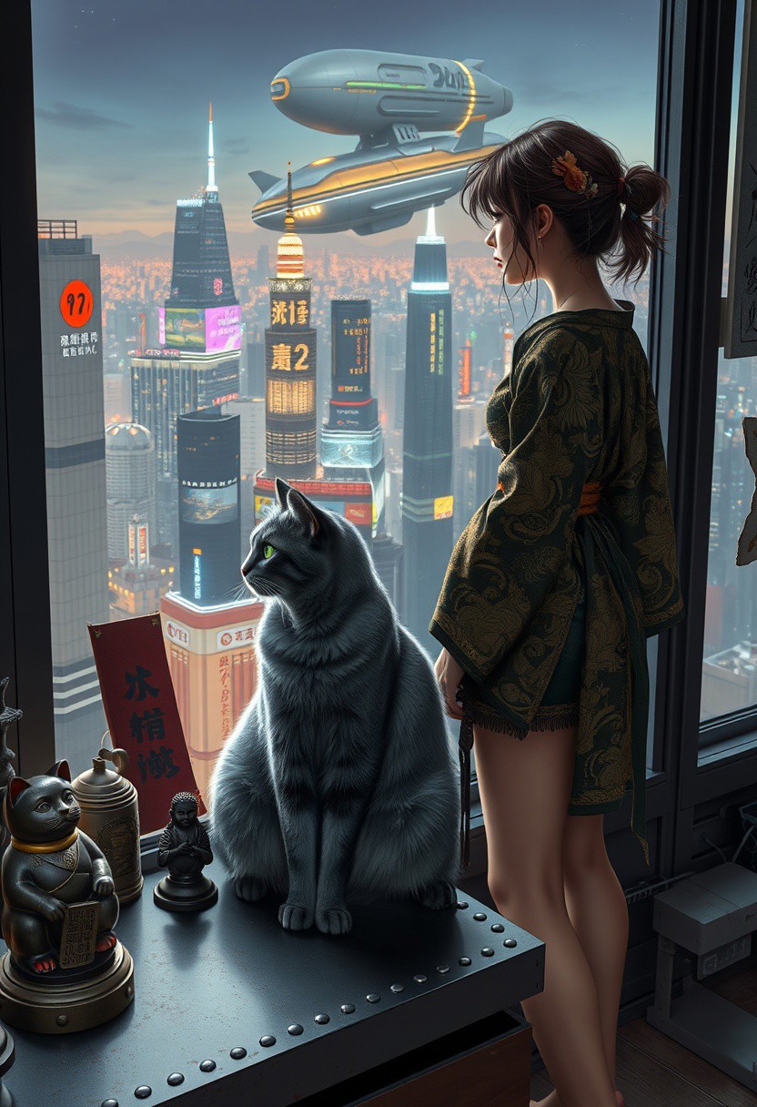 Grey tabby cat with greensits on a cluttered metal riveted desk next to a maneki neko statue and small bronze buddha, the cat is looking out to a floor to ceiling window that looks out over a futuristic cyberpunk Tokyo skyline with skyscrapers and futuristic airships covered with lights and advertisements in Japanese, a tall thin beautiful young woman, 22 years old, is standing next to the cat looking out at the city through the window, The woman is dressed in an ornate short japanese style bath robe, exposing her long legs. The woman's hair is messy from just waking up. Artistic cyberpunk, dynamic perspective,