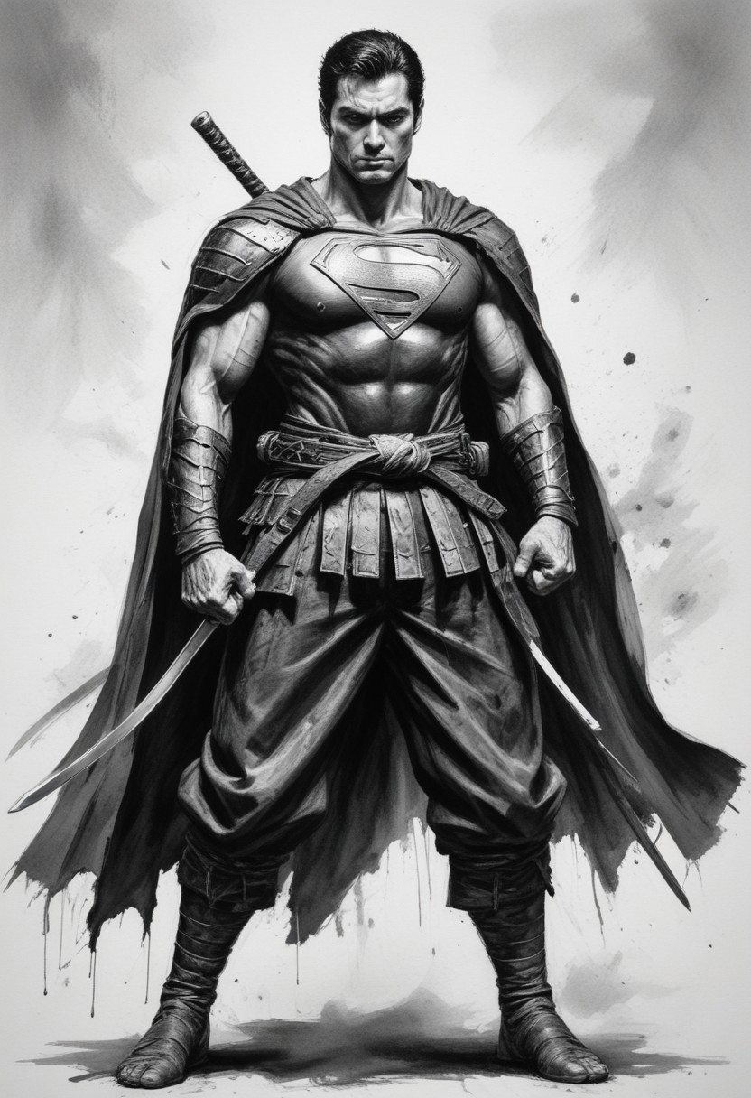 standing pose of Superman samurai, he wears the classic samurai suit, professional studio quality image, heroic pose, dramatic lighting, ultra realistic photograph, professional art, black and white ink art painting