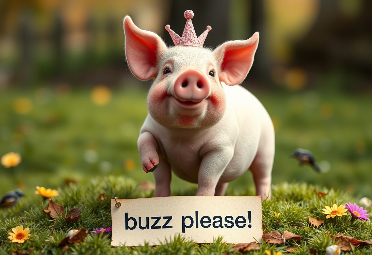 fairytale pig, text that says "buzz please!"