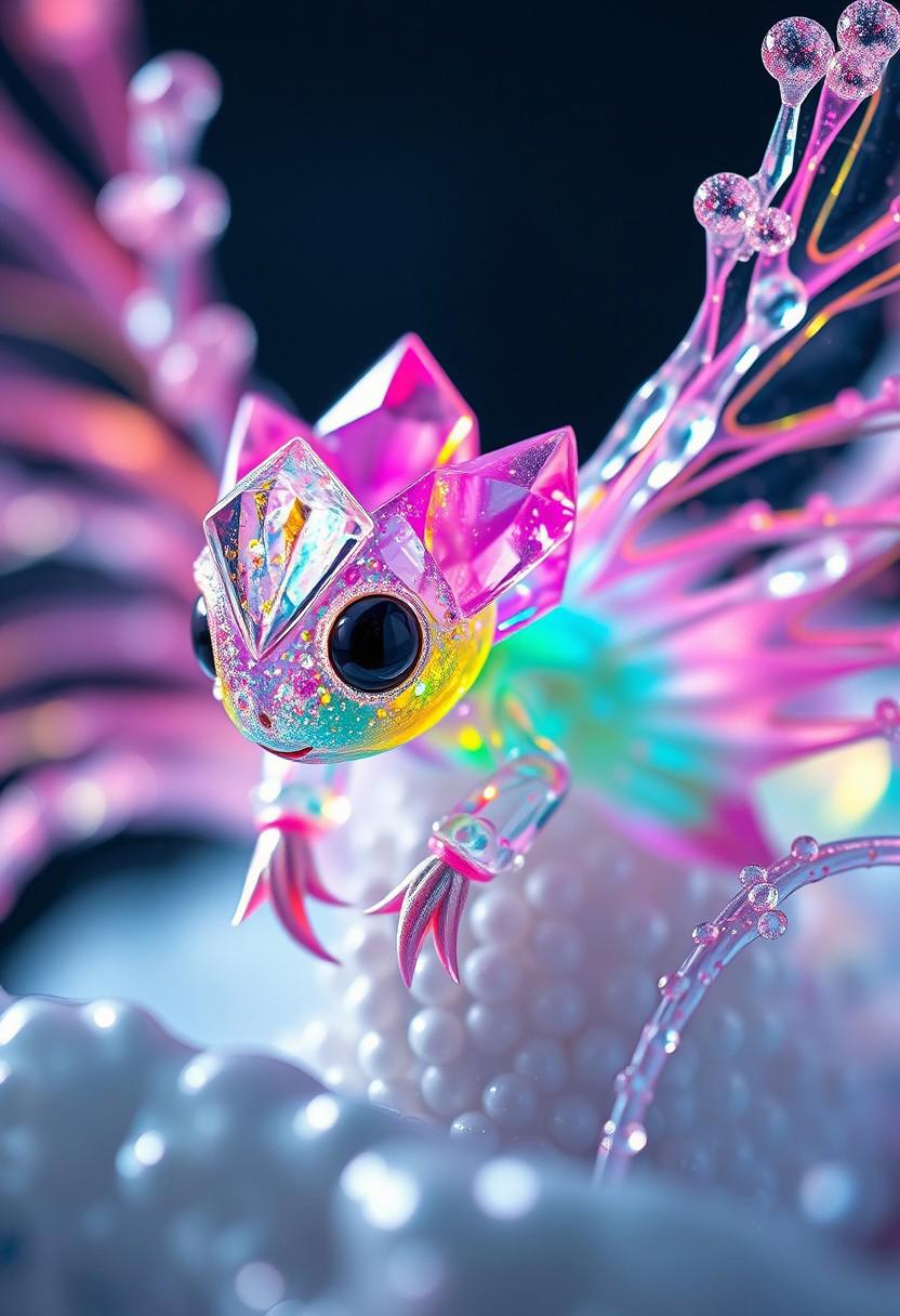 Mythical glowing Cute creature Body made of colorful crystal,Alien Flora, water hydroforming, terraforming. Alien Flora, Miki Asai Macro photography, close-up, Miki Asai’s visual style is ethereal and dreamlike, capturing the beauty of nature in a delicate and poetic way, hyper detailed, trending on artstation, fantastic Realism and Sharp Focus, studio photo, intricate details, highly detailed, by greg rutkowski detailed face, detailed skin, reflection