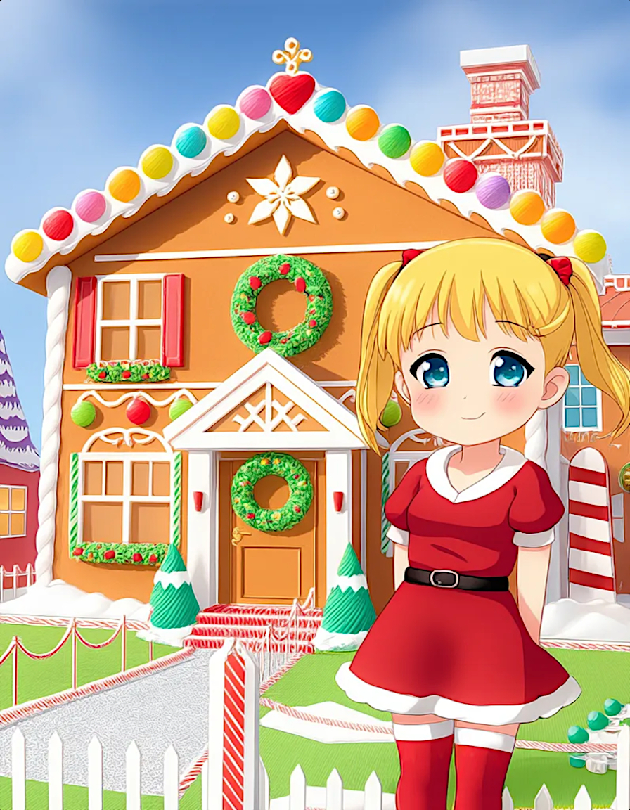 The image is a rendered theatrical anime scene of a front view of well crafted two-story gingerbread house. The house is constructed from gingerbread in a whimsical style, giving the scene a luxurious and magical festive ambiance. The house features a steeply pitched roof with colorful gumdrops running along the top, a symmetrical design and detailed craftsmanship with a mid-century design theme. The central front door includes a green and red wreath made of icing. The house is set on a grass lawn dusted with powdered sugar. Prominently featured close in the foreground on the right side is a grinning young tsundere chibi anime girl with blonde twintails hair and pretty blue eyes, She's wearing zettai ryouiki white thighhighs, a glossy short sleeved red Santa Dress and red boots, she has blonde hair in twintails, her red dress has a teal triangles geometric border on the hem.