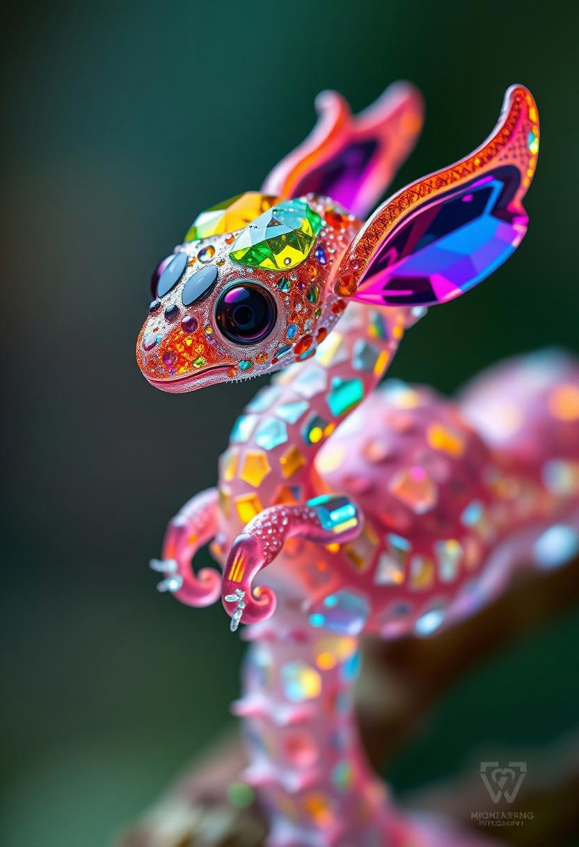 Prismatic cute creature like a Cobra mix with bird body made of glowing colorful gems and crystal,Alien Flora, water hydroforming, terraforming. Alien Flora, Miki Asai Macro photography, close-up, Miki Asai’s visual style is ethereal and dreamlike, capturing the beauty of nature in a delicate and poetic way, hyper detailed, trending on artstation, fantastic Realism and Sharp Focus, studio photo, intricate details, highly detailed, by greg rutkowski detailed face, detailed skin, reflection