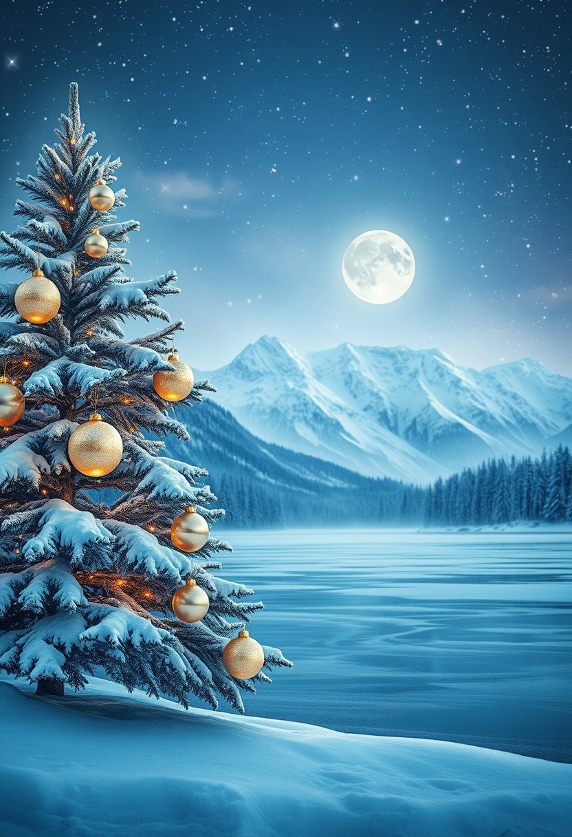 Winter, magical night. Beautiful starry sky. On the shore of a beautiful frozen lake stands an incredibly beautiful New Year tree, Several elegant Christmas decorations adorn the branches, including glossy spheres in soft pastel shades of gold and white, gracefully decorated with frost patterns, in the background, in the middle of a fabulous magical winter forest, huge mountains rise. On the mountains, the snow sparkles in the moonlight.