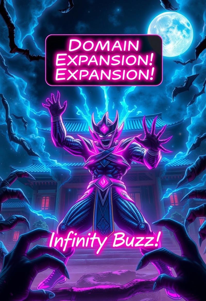 Ultra realistic. Gojo Satoru in his domain expansion realese pose ready to unleash his power,surrounded by a celetial aura of power and curse energy, in front of a japanese temple under a full moon night,surounded by evil curses ready to claw away at him to end his life, yelling "Domain Expansion! Infinity Buzz! " text in neon purpure letters inside a text balloon