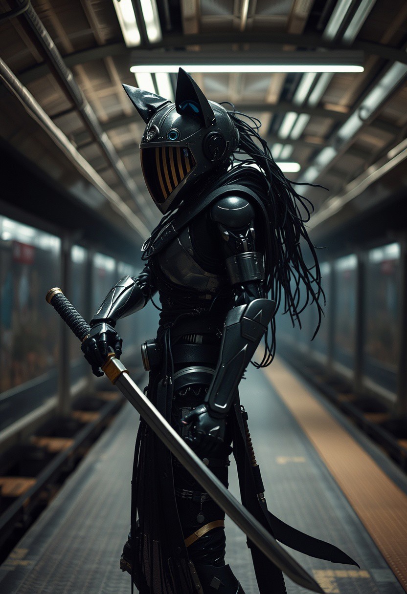 a cyberpunk robot samurai Anthro wolf woman, robot anthropomorphic wolf face with mirrored face shield, robot joints, body made of metals, cables and wires, holding a katana by the hilt, in a cyberpunk subway station, dim lighting from overhead strip lighting, silhouetted in the gloom. brooding pose. Perfect Composition, realistic photographic image, RAW photo highest quality, perfect directional lighting