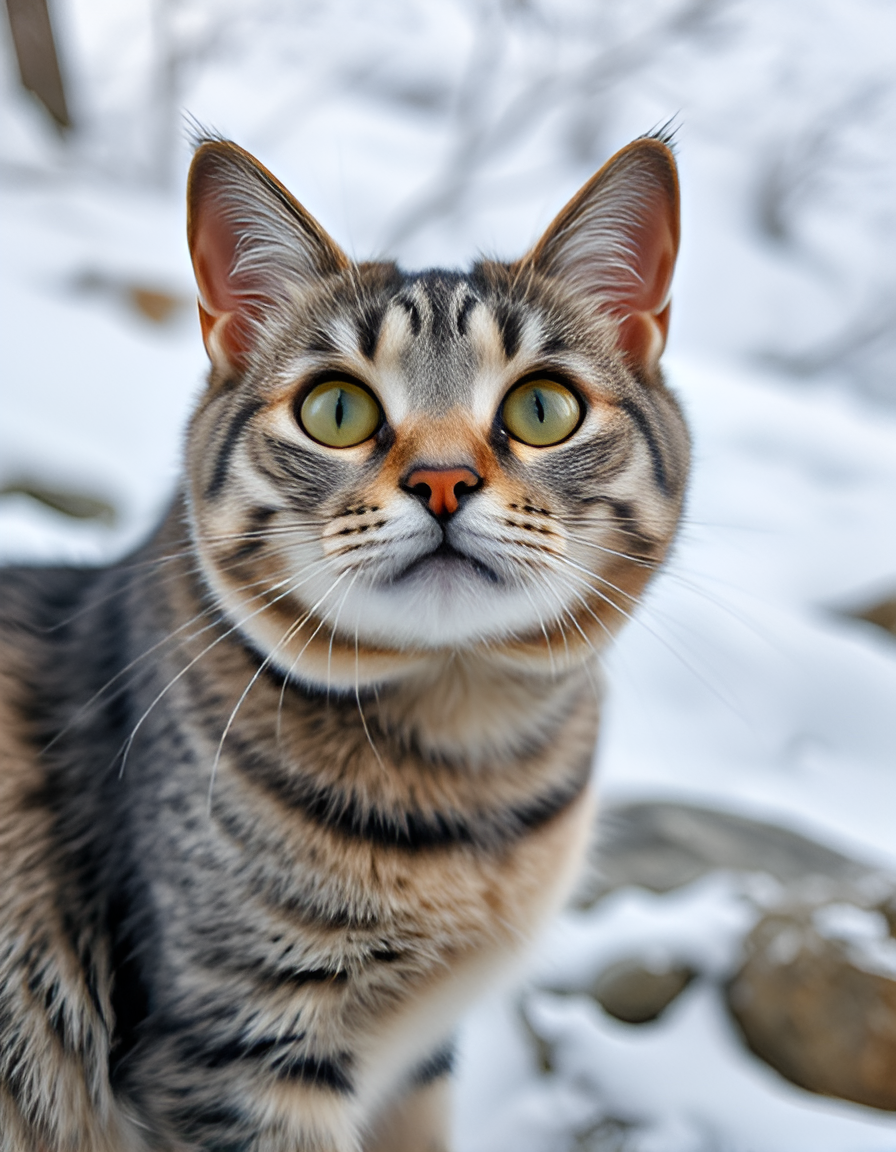outdoors in the alpine winter, a friendly looking grey tabby cat looks up at the viewer