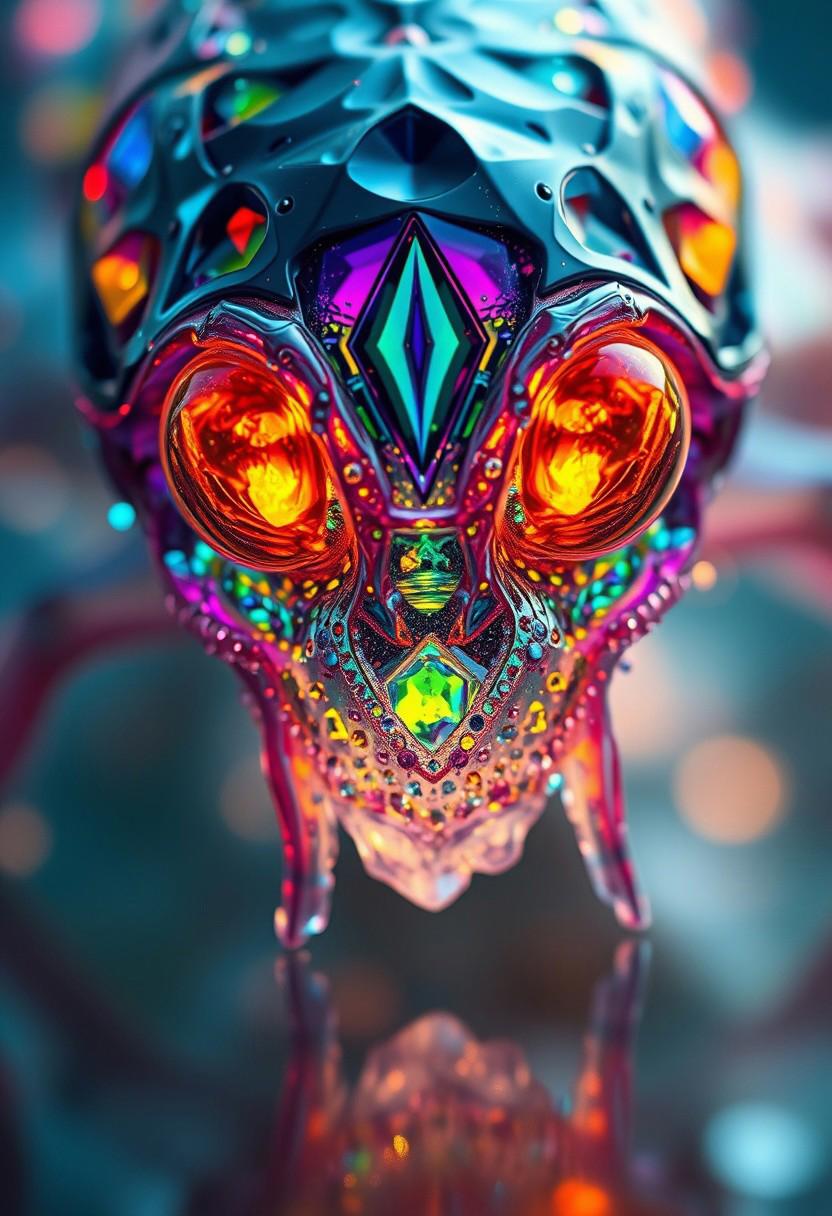 Prismatic creature body made of glowing colorful gems and crystal,Alien Flora, water hydroforming, terraforming. Alien Flora, Miki Asai Macro photography, close-up, Miki Asai’s visual style is ethereal and dreamlike, capturing the beauty of nature in a delicate and poetic way, hyper detailed, trending on artstation, fantastic Realism and Sharp Focus, studio photo, intricate details, highly detailed, by greg rutkowski detailed face, detailed skin, reflection