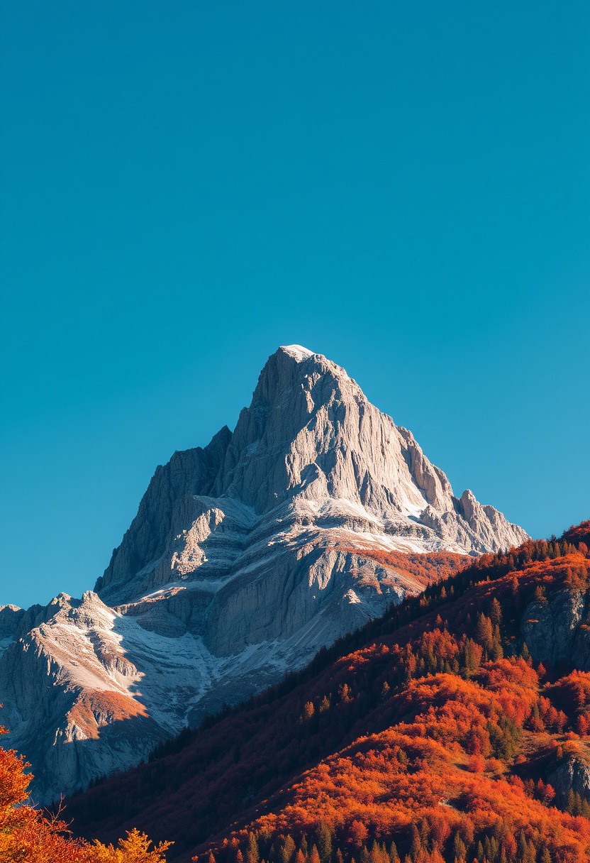 towering mountain peak, autumn scenery with vibrant fall colors, clear sky with no clouds, crisp atmosphere, golden and red leaves, sharp mountain textures, dramatic sunlight, wide-angle shot, professional composition, serene and peaceful.