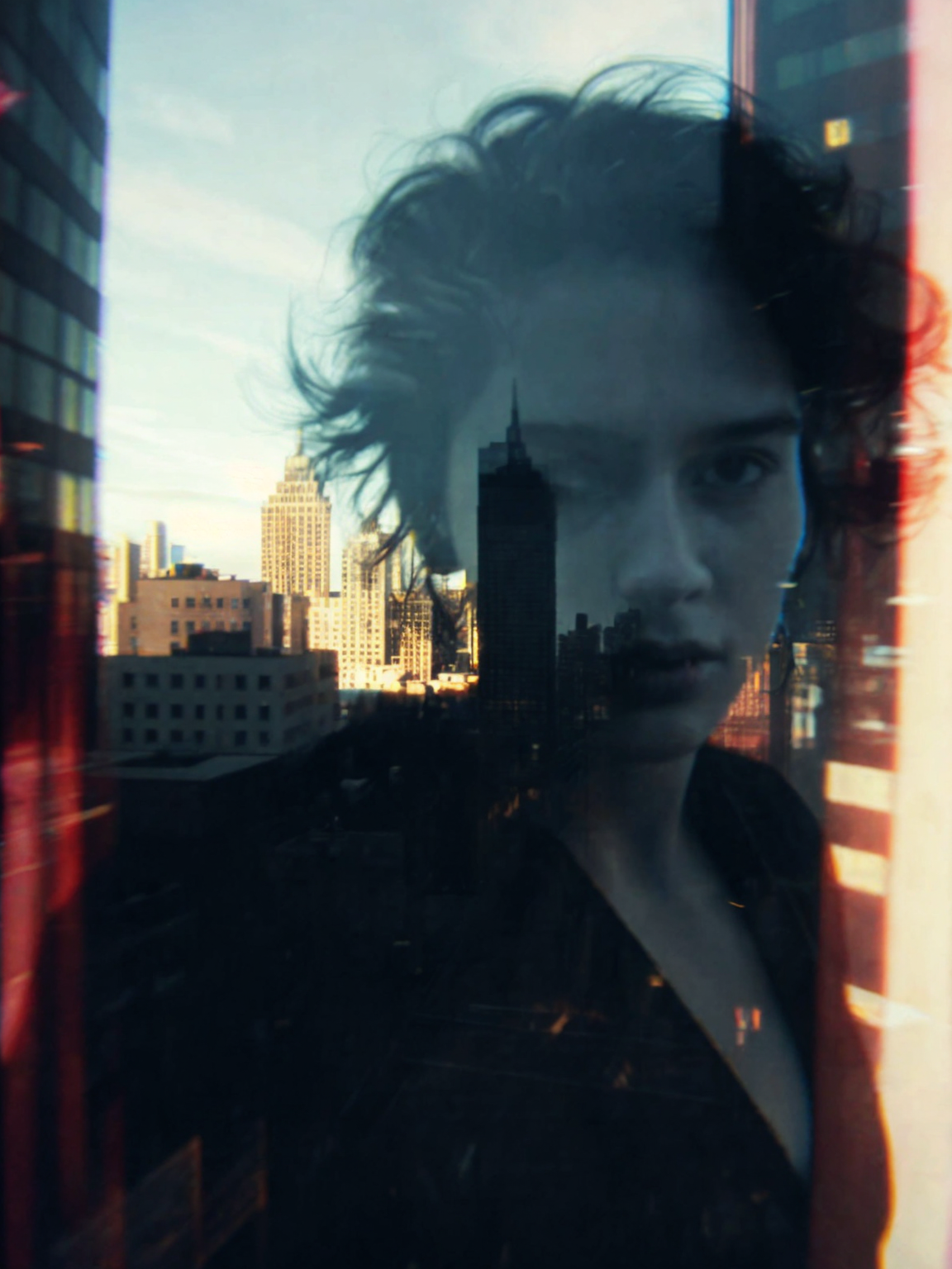 double exposure, ghostly portrait superimposed onto a city, unique perspective, cinematic angle, glitch, chiaroscuro