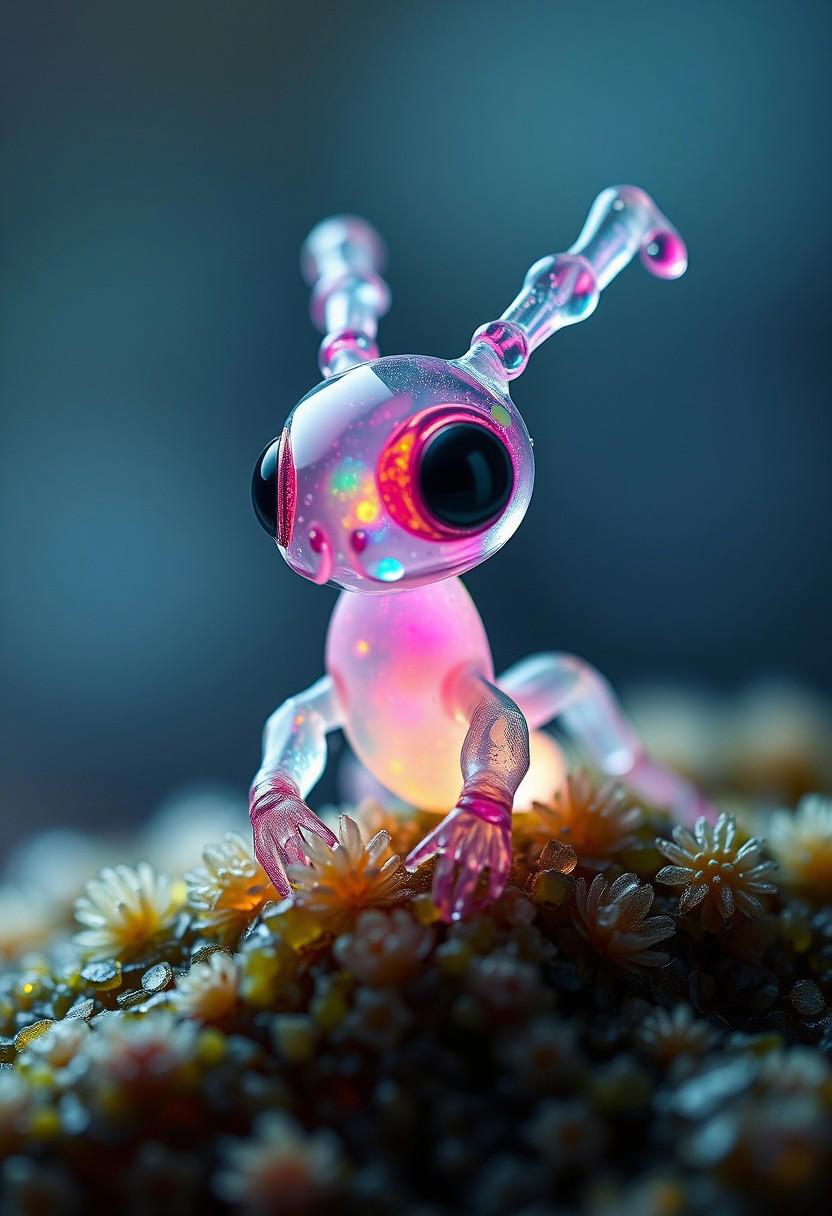 Mythical glowing Cute creature body made of colorful crystal,Alien Flora, water hydroforming, terraforming. Alien Flora, Miki Asai Macro photography, close-up, Miki Asai’s visual style is ethereal and dreamlike, capturing the beauty of nature in a delicate and poetic way, hyper detailed, trending on artstation, fantastic Realism and Sharp Focus, studio photo, intricate details, highly detailed, by greg rutkowski detailed face, detailed skin, reflection