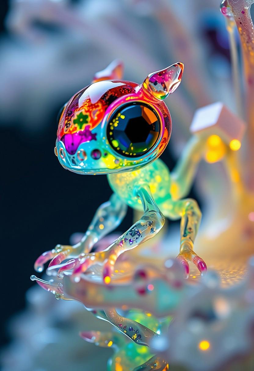 Mythical glowing Cute creature body made of colorful crystal,Alien Flora, water hydroforming, terraforming. Alien Flora, Miki Asai Macro photography, close-up, Miki Asai’s visual style is ethereal and dreamlike, capturing the beauty of nature in a delicate and poetic way, hyper detailed, trending on artstation, fantastic Realism and Sharp Focus, studio photo, intricate details, highly detailed, by greg rutkowski detailed face, detailed skin, reflection