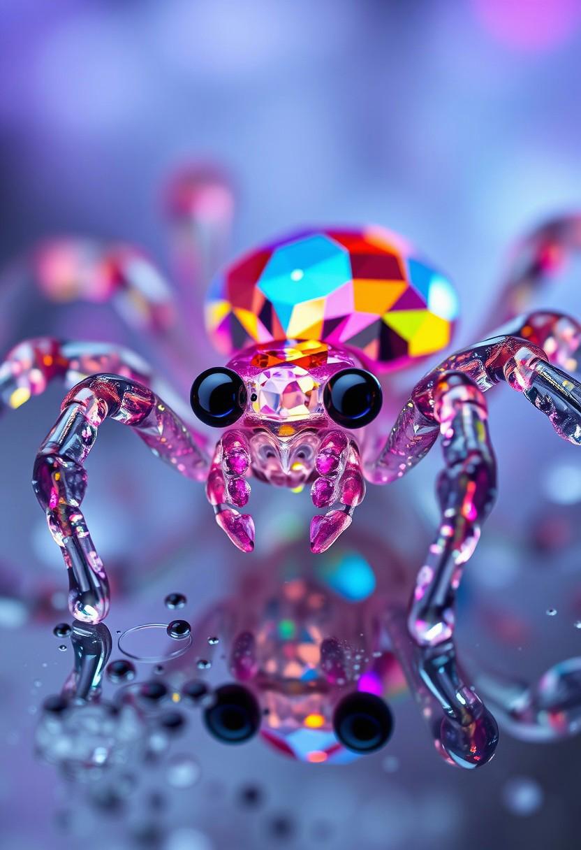 Prismatic cute creature like a spider body made of glowing colorful gems and crystal,Alien Flora, water hydroforming, terraforming. Alien Flora, Miki Asai Macro photography, close-up, Miki Asai’s visual style is ethereal and dreamlike, capturing the beauty of nature in a delicate and poetic way, hyper detailed, trending on artstation, fantastic Realism and Sharp Focus, studio photo, intricate details, highly detailed, by greg rutkowski detailed face, detailed skin, reflection