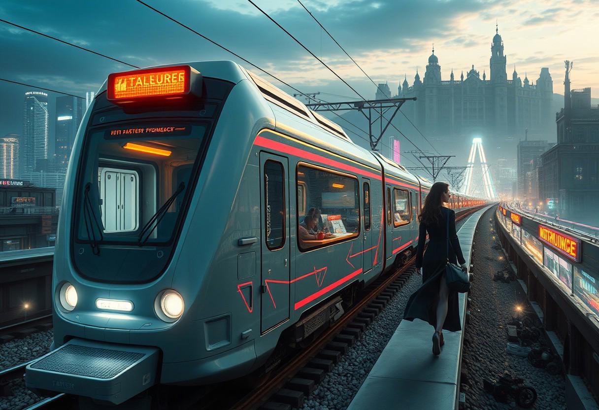 ultra realistic, photo realism, image, of an ultra modern train equipped with ultra modern technology, passing through a cyberpunk style of an ultra beautiful woman walking the streets of a cyber city, an ultra beautiful landscape with an ultra realistic and ((modern fortress resurrected from the past))