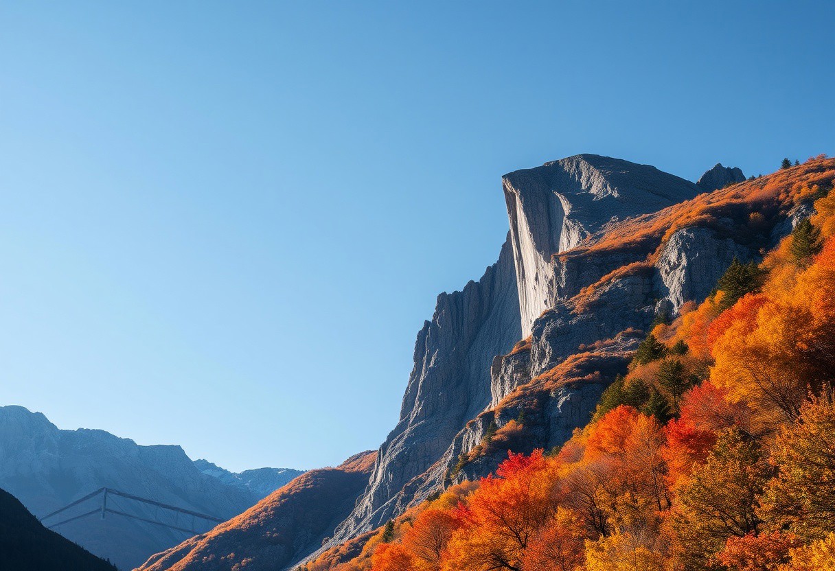 Award-winning photography, towering mountain peak, autumn scenery with vibrant fall colors, clear sky with no clouds, crisp atmosphere, golden and red leaves, sharp mountain textures, dramatic sunlight, wide-angle shot, professional composition, serene and peaceful.