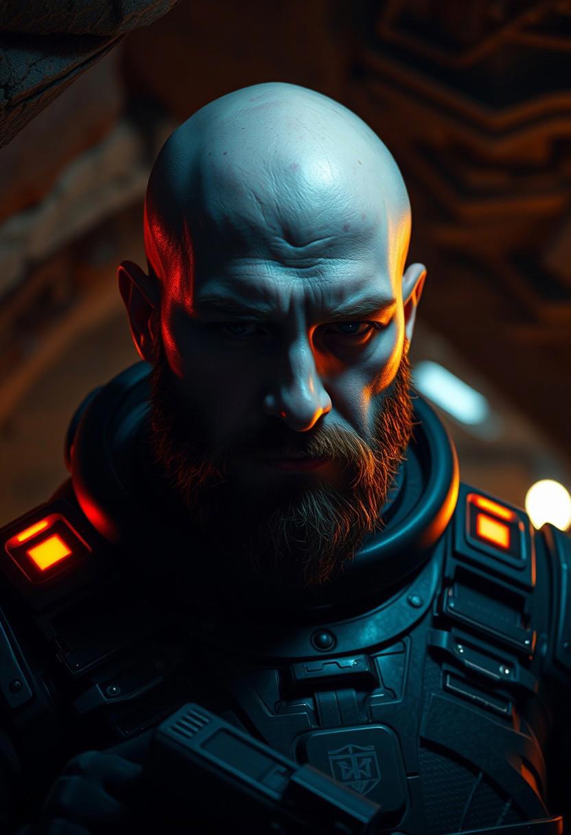 close up of a soldier, bald, bearded, in a underground dungeon, full uniform, high tech exosuit uniform, tense environment, night time, bio luminescent mechanisms, highly detailed, detail rich, suspense,