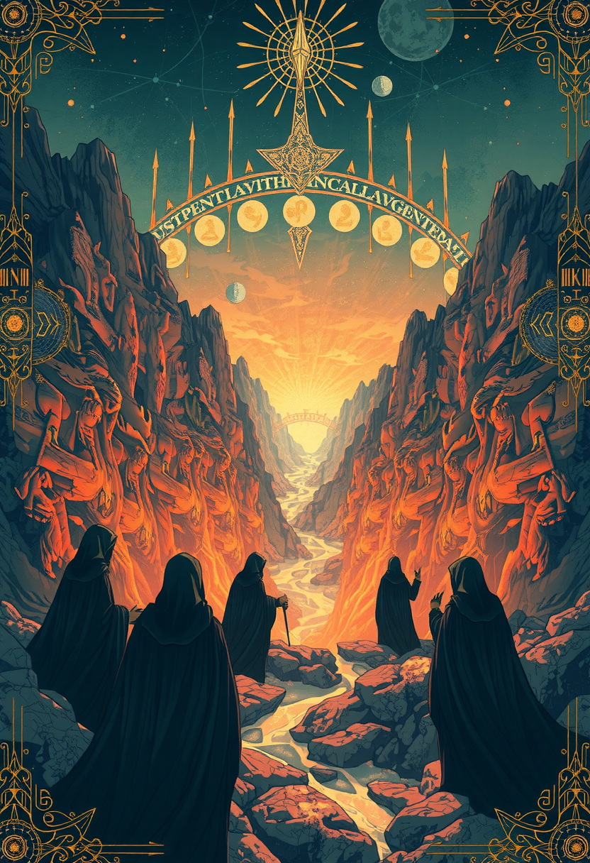 In the style of kilian eng, A three dimension illustration with accents of hyper detailed illustration, neo surrealism, intricate design, occult ritual in river valley, figures in black hooded robes, multiple views, recursion, firgures repeating into distance, data lace, hyper grid, alchemy ,vril maidens, le parc, alchemy,,chemigram,, In the style of alan lee.