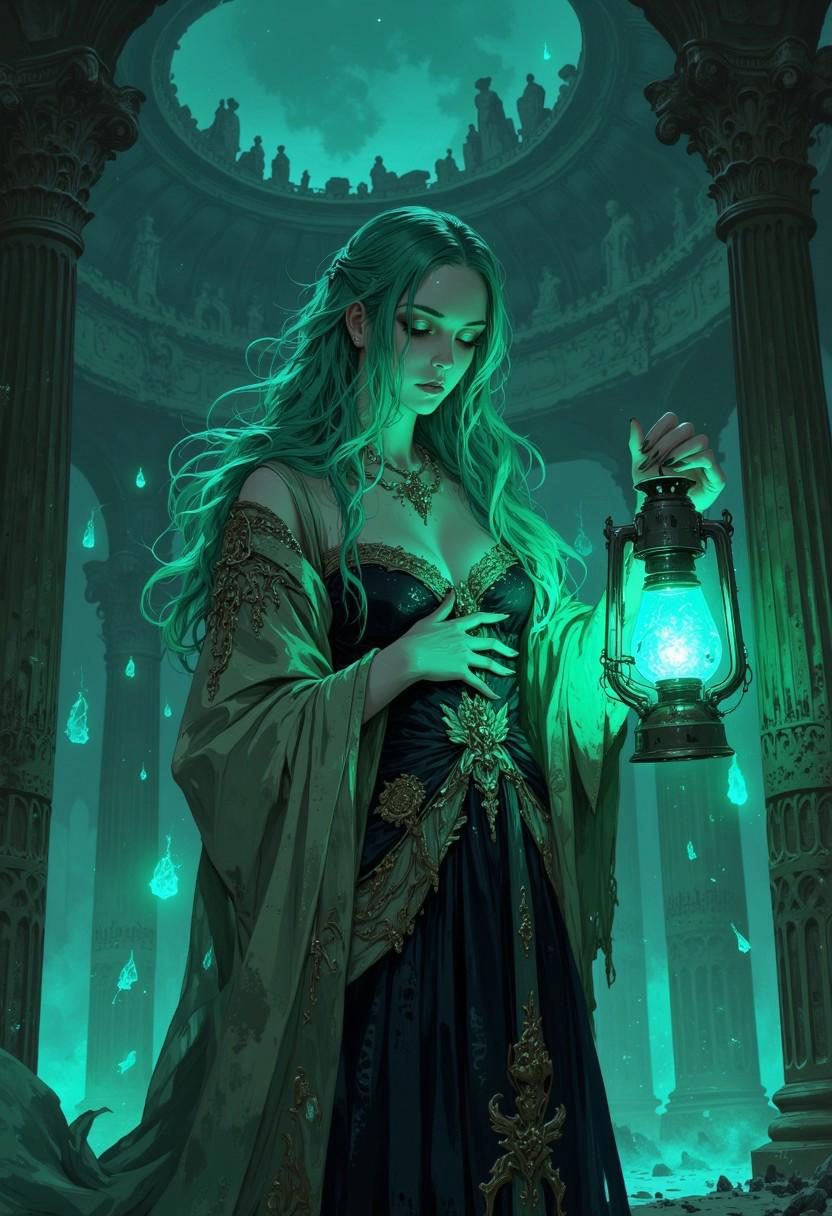 Subject: A ghostly figure with translucent, pale skin and hollow, glowing blue eyes that leak faint trails of light like tears. Their long, emerald hair flows outward as if caught in an eternal wind. Their expression is one of sorrowful resignation, their lips slightly parted as if caught mid-chant. Pose: The Harbinger’s upper body leans slightly forward, one hand gripping the edge of a spectral lantern while the other clutches their chest. Their shoulders are hunched, creating a sense of emotional weight. Lighting: A pale, cold light radiates from the lantern, casting haunting shadows across their face and torso. Faint, ethereal glows of green and blue drift in the background, adding depth and an otherworldly quality. Attire: A flowing Baroque gown of tattered silk, its once-opulent embroidery faded and frayed. Chains of spectral energy drape from their shoulders, disappearing into the mist that envelops their form. Background: The interior of a decaying, moonlit mausoleum with towering columns and shattered statues. Wisps of ghostly light move through the air like fireflies, adding a sense of haunting beauty.. Cinematic anime, film, bokeh, professional, 4k, highly detailed.