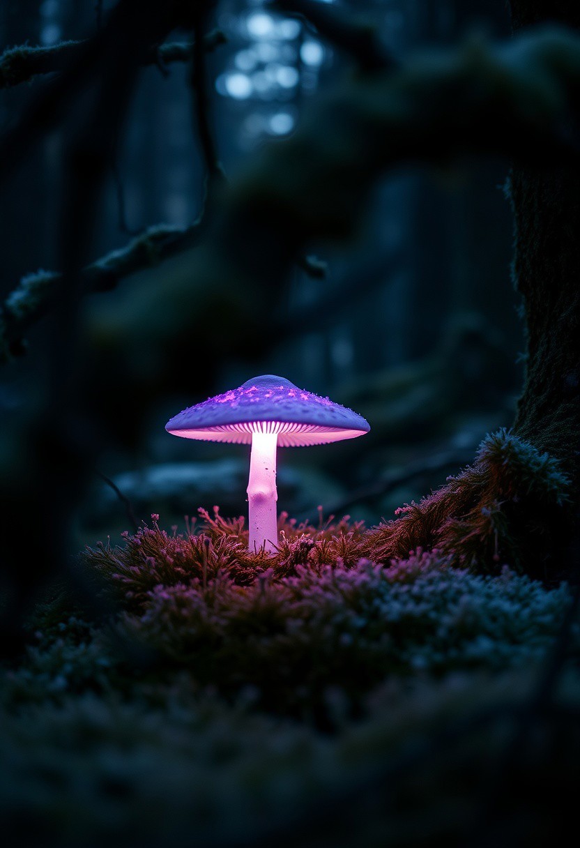Photorealistic film image: A mushroom, emitting a supernatural violet glow, sprouts form the frozen moss in the dense, dark forest in winter. Our view is partially obscured by heavy branches, shaggy with moss. Shallow depth of field.